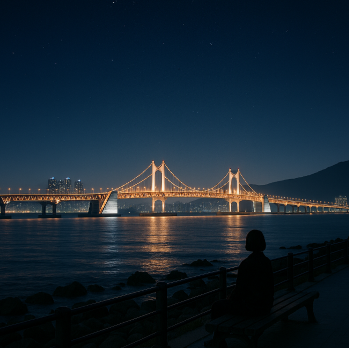 1. 광안리 해변 – 광안대교 야경의 정석 광안리 해변에 앉아 바라보는 광안대교의 야경은 부산을 대표하는 장면 중 하나입니다. 밤이 되면 다채로운 조명으로 물드는 다리와 파도 소리가 어우러져 혼자여도 전혀 외롭지 않습니다. 해변 주변에 혼자 머물기 좋은 카페도 많아, 긴 밤을 감성적으로 보낼 수 있습니다.