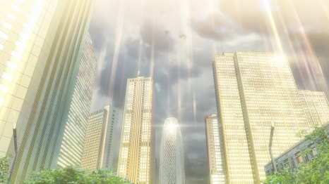 비 내리는 도쿄, 한 소녀가 어머니를 간호합니다. 소녀는 비 오는 걸 보다가 한 곳에서 빛이 내리쬐는 걸 발견하고 뭔가에 이끌려 빛이 내리쬐는 건물 옥상으로 갑니다. 건물 옥상에는 신사가 있었고 소녀는 염원을 하는데 신사를 통과하는 빗방울들이 거꾸로 올라가면서 소녀는 하늘을 납니다. 꿈이 아니고 소녀가 소원을 빌자 날씨가 화창하게 바뀝니다.