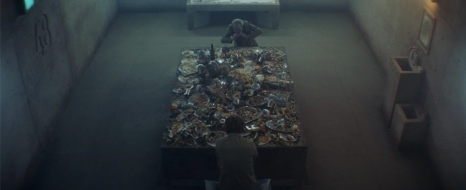 미히루가 다른 수감자 두 명과 싸우고 있어 그녀를 구하려고 하지만 그녀는 죽고 그들은 심하게 다칩니다. 고렝과 바하랏은 계속 내려가 플랫폼이 정지하는 333레벨에 도착합니다. 고렝은 침대 밑에 숨어있는 아이를 발견을 하는데 미히루의 딸이었습니다. 바하랏은 처음에는 꺼려 했지만 그들은 소녀에게 맨 위에 있는 행정관들을 위한 메시지로 그들이 모아온 손대지 않은 판나코타를 그녀에게 먹입니다.